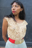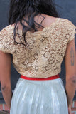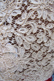 Beautiful lace sheath with zipper down the side and zipper closure under left armpit. There is a four-inch band of silk crepe at the bottom of the blouse. This piece is very delicate, unique and charming.