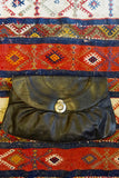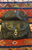 Oversized black leather clutch with stitched details and great clasp, probably European. Thick but very supple leather.