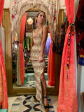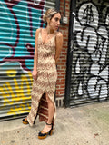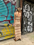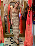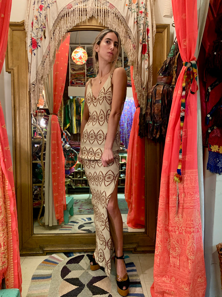 Super cool jacquard vintage knit dress. Scoop neck and back and slit up the side. There are areas that have been repaired. Otherwise it’s in very good vintage condition.