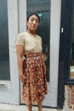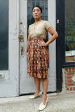Beautiful beaded dress with variegated brown and white sequins on the top and floral pattern on skirt. Buttons down front and has zipper back. Top is silk, bottom feels like an Egyptian cotton.