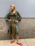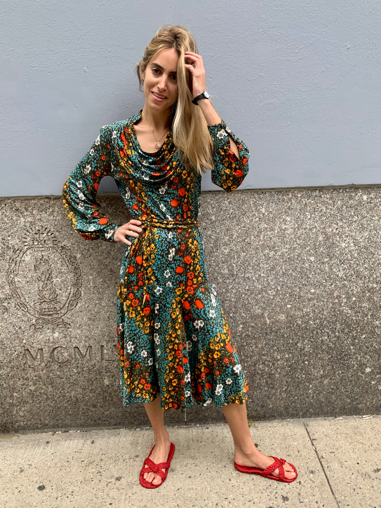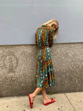 Gorgeous print on this silk jersey dress by Italian designer Emilia Bellini. Draped neck, drop waist and gold-tipped cord belt make this dress easy and elegant. Excellent vintage condition.