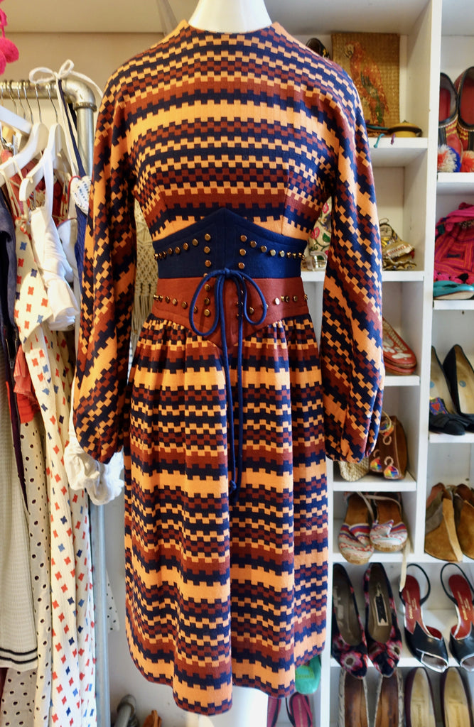 Wool blend dress with a great geometric print and built-in studded cummerbund detail. Brand is Junior Accent.