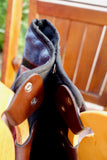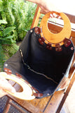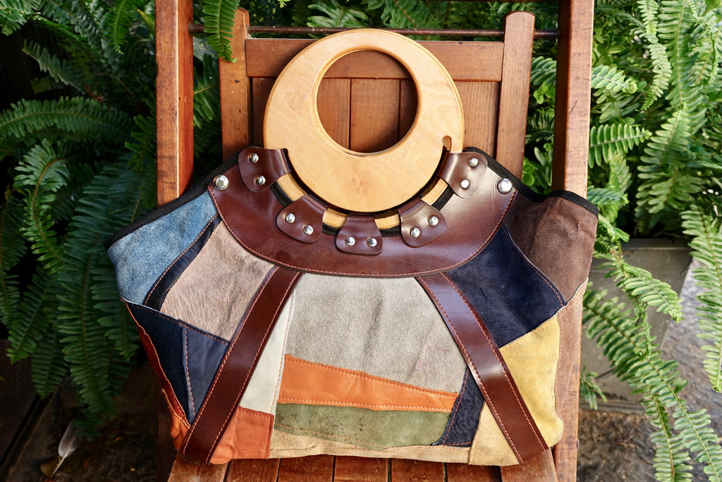 1970's bag with a terrific patchwork construction and wooden handles. The bag is made of multicolored suede with snap closures.