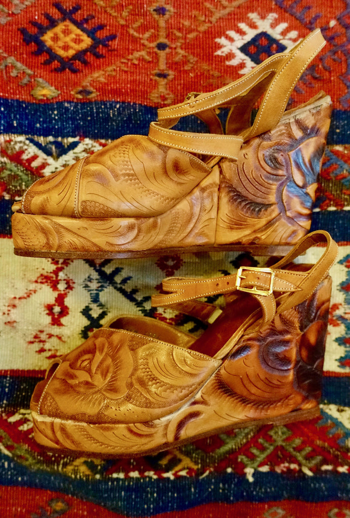 1970s brand "Trashy" bohemian tooled leather wedges, in great and wearable condition.