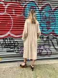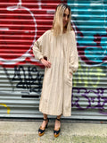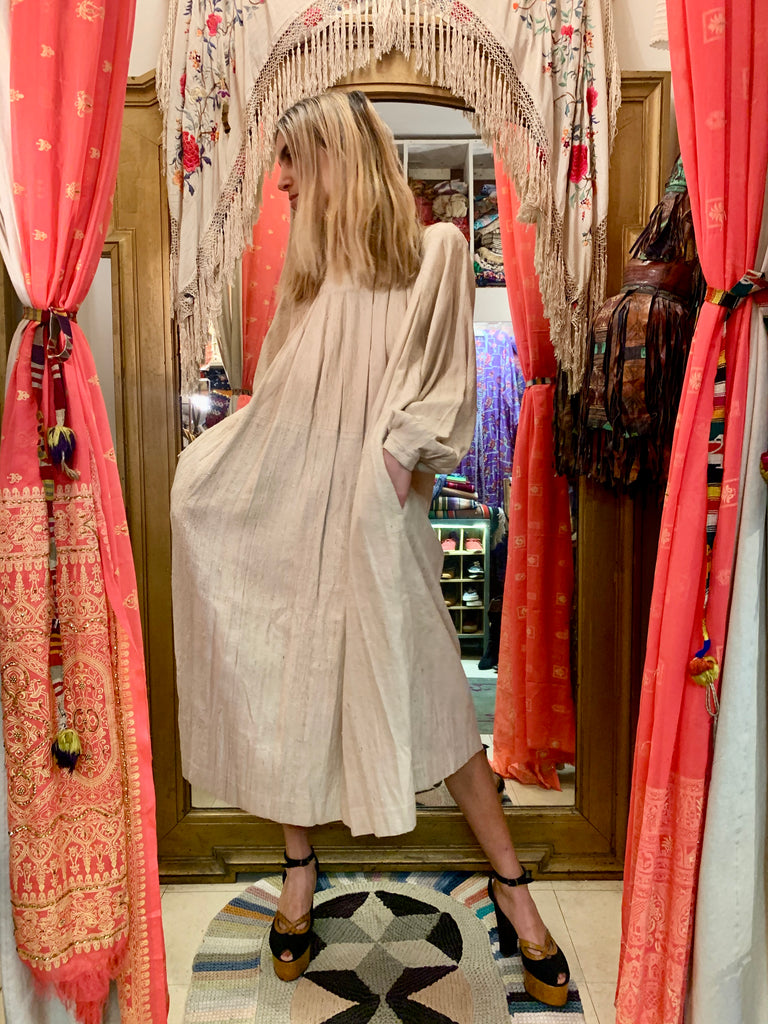 Gorgeous woven silk and cotton fabric pleated dress with side pockets. Button closure at neck and wrists. Color variations from cream to light gold in woven textured fabric. The perfect dress that can be worn as is or belted. Excellent condition.