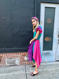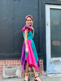 Fun, colourful multi-color panel dress with ruffled sleeves and a bit of spring May Day Festival vibe. Designed by the cult darling of the fashion world, Giorgio Sant’ Angelo. Dates from the early 1980’s.