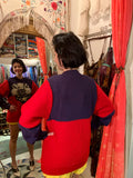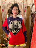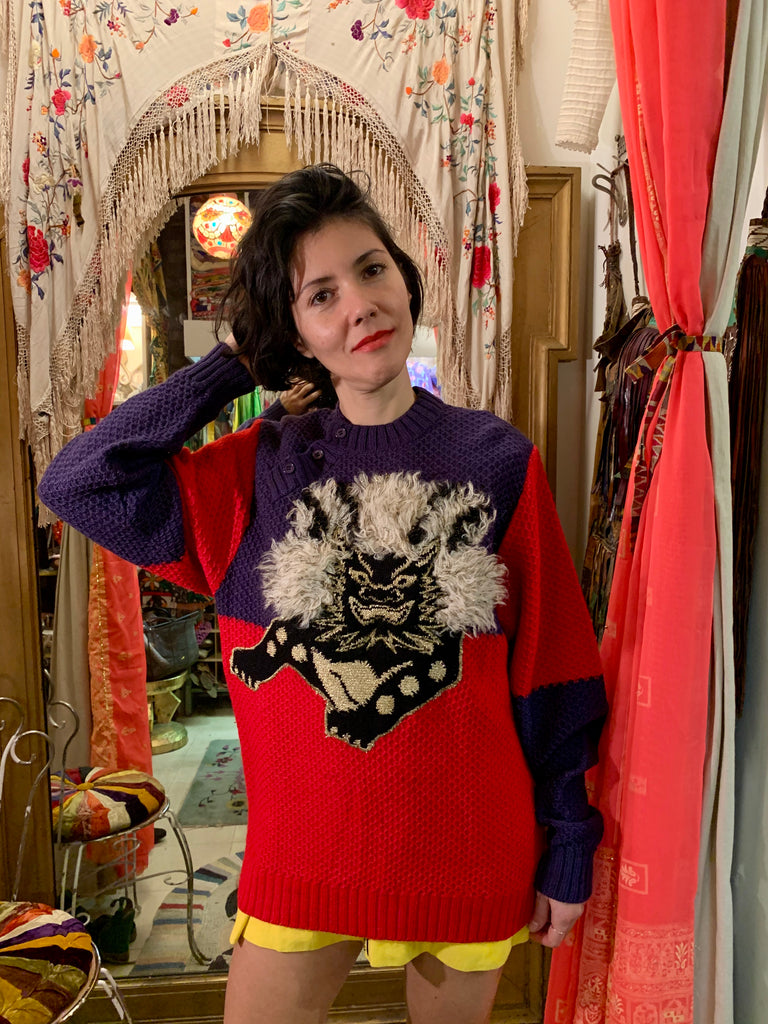 Great knitwear from designer Kansai Yamamoto. Beautiful textured purple and red knit with metallic gold thread and black lion with big fluffy mane. Button closure at neck. Dates from the 1980’s. Excellent condition