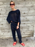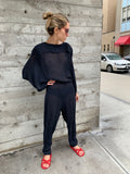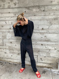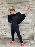 Great draping and movement in this easy 1980’s thin black knit jumpsuit. Elastic waist but would also look nice with a belt. Very Good Vintage Condition.