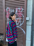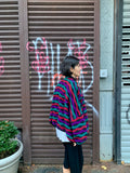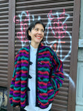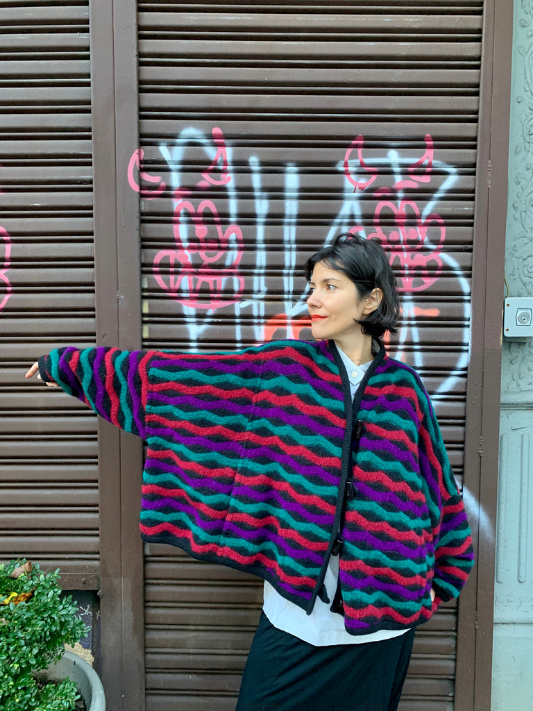 Great swirly stripe knit with pop neon colors. Batwing sleeves and toggle buttons plus a drapey, twenty bottom makes this sweater easy to wear and can double as a light jacket.