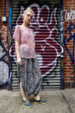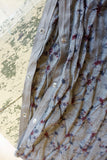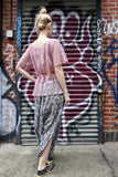 Unique harem-style pants by Coming Soon, originally priced at $550. These pants are marked made in Italy, material is woven wool. The pleated fabric has been treated so it has a rippling print-like texture. Legs open on the sides with snaps (see photo)