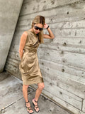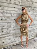 Extravagant draping and unexpected construction on this sexy liquidy gold dress by Vivienne Westwood Anglomania. Deadstock with original tags attached. Tag Size 40. Excellent Vintage Condition