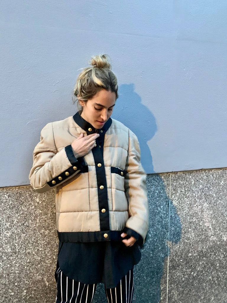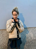 Classic Chanel quilted cream and black jacket with Chanel button snap closure. Great vintage condition. Fits a Small to Medium Size.