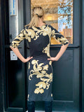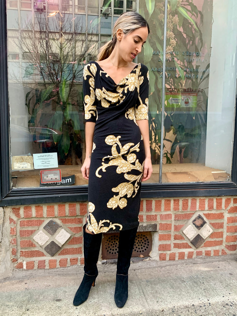 Relief-like print with metallic gold fantastical flora/fauna. Cropped sleeves and curvy, draped fit. Good condition with some faint pilling throughout. Dates from 1990’s through early 2000’s.