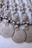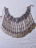 This necklace is a beautiful example of Afghani tribal jewelry from the Nomadic Kutch people. It is a made from a silver composite typical of these pieces. This tiered choker begins with enamel and silver inlay linked by chains with a hand tooled clasp. The next tier has fish-like stamped ornaments, followed by flowers and then old coins.
