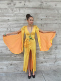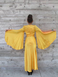 Wonderful satin shimmery gold Biba Dress with tangerine colored reverse side. Wide flowing batwing sleeves slit down the arm for dramatic effect. Sash ties in the back. High silt in front. The fabric is somewhat transparent so a slip, camisole or boy shorts might be needed if this bothers you.