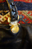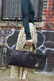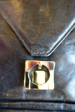Unusual long rectangular black leather handbag with braided handle and pocket detail. There's a functional outside pocket, buckle tongue is missing. Has a zipper closure and inside zipper pocket. Label is Gasparini