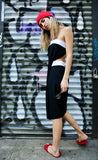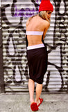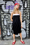 Super chic and effortless backless strapless dress with white bands and black jersey by Maison Martin Margiela. Old label with the blank band and white stitching. Cool, functional and modern dress.
