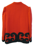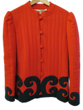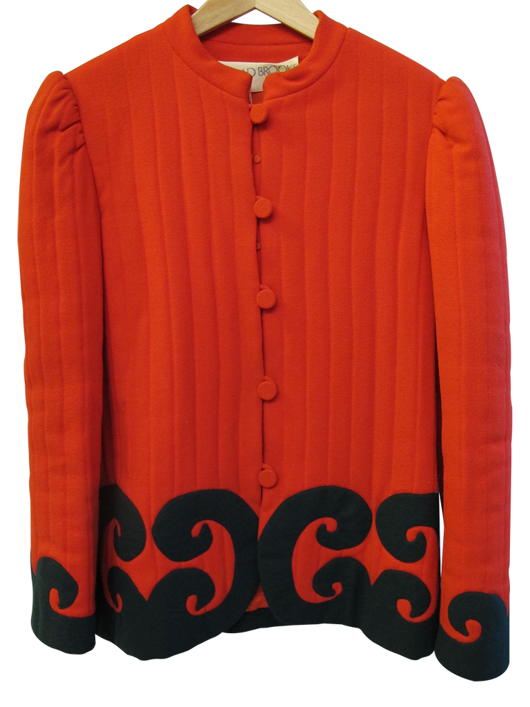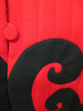 1980's quilted red jacket with black appliqué swirl detail on hem and sleeve edge by collectible American designer Donald Brooks. No fabric tag but it feels like a blend of natural and synthetic fibers. A very original, rare and stunning jacket.