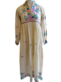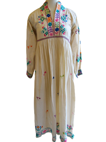 Lovely early dress with folkloric embroidery of flowers, leaves and whimsical flourishes. 100% cotton material.