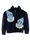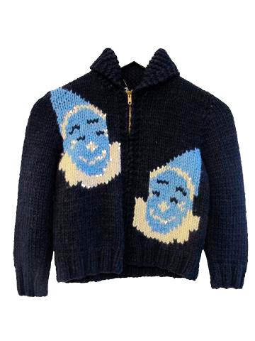 So cute! Youth or small person hand-knit cardigan wool sweater. Closes with metal zipper. Great circus imagery - two smiling clown faces on the front and a leaping elephant on the back.
