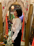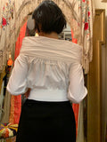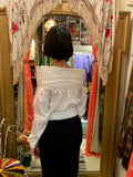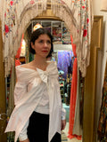 Very feminine and charming white bow blouse with gathered, off-the-shoulder neckline and bow. Dates from the 1990’s to early 2000’s. Excellent Condition.
