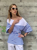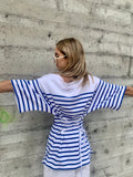 Great combination of fabric, vibrant blue and white colors, shape and details on this classic nautical piece by Jean Paul Gaultier. Drop shoulder and adjustable laced back make this top special, customizable and effortlessly chic. Excellent Condition. Tag Size S.