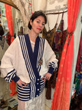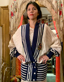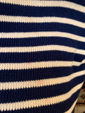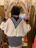 Fun spoof on the traditional preppy tennis sweater with club emblem, double-breasted buttons, oversized draping, horizontal cables and striped ribbing. This has a matching navy striped skirt if you want to wear it as a set. Great condition with some slight bleed in the stripes in the bottom back (see photo.) Dates from the 1980’s.