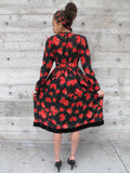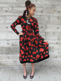 Rare iconic YSL floral print wool dress from the 1980's with matching belt and head scarf. Woven wool fabric with red rose print. Velvet trim on hem. Please note the original YSL label is missing.