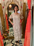 Gorgeous antique dress in incredible wearable condition. Sheath dress with lace midriff and sleeves underwear with elaborately embroidered floral overleaf panels in front and back. Underdress closes with snaps and eye and hooks. Would make an excellent wedding dress and keepsake. Dates from the early 1900’s. Great Condition.