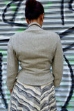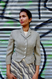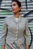 Stylish blue-gray tweed blazer, with scallop tab details on waist and sleeves. Tag reads Mingea Chicago. Feels like a wool/cotton blend.