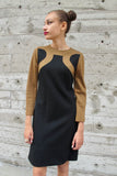 Beautifully constructed shift dress - graphic pattern is made of individually sewn pieces rather than a print. Material is wool, dress is fully lined.