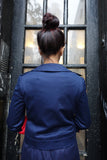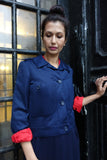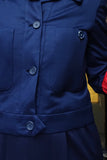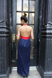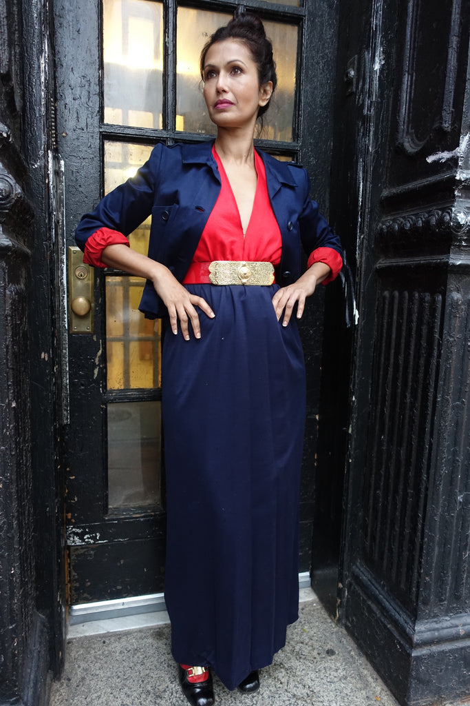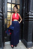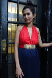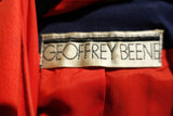 Classic Geoffrey Beene - the dress is a long halter style blue skirt with red top and an open back. Jacket has a military feel with oversized breast pockets. Jacket is navy and lined in red silk. The dress is also lined in silk. The fabric feels like a silk/cotton weave. Belt pictured is not included.