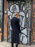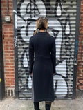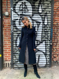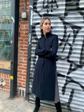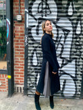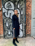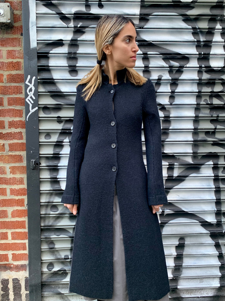 Sleek deep charcoal button-down coat with slide slits and pointed collar that can be worn up or down. Very slim textured silhouette that can be work as a layer, sweater or outer wear. This alpaca and wool combination is warm without being bulky or itchy. Excellent condition