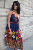 Hand embroidered flowers and decorative flourishes on woven indigo-dyed cotton skirt. Vibrant colors and beautiful handiwork from the Banjara Tribe of the Rajasthan Desert in Central India.