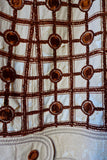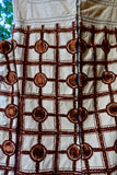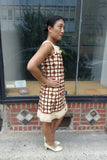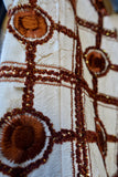 Amazing pleather-over-velvet mod dress with geometric embroidered pattern. No label in dress, but probably a Courreges, the material and button details are signatures of that designer.