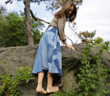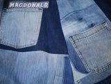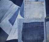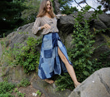 The Daniela Denim Patchwork Wrap-skirt is handmade from four pairs of vintage military jeans. The beautiful textural and tonal gradations from years of wear plus scattered vintage repairs and dark blue pocket "shadows" all create an extraordinary textile mosaic of blue skies and ocean blues. Dive in and wrap the Daniela skirt around you for year-round, season-less chicness.