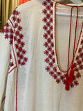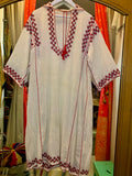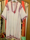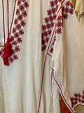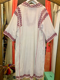 These old hand-embroidered pieces are becoming rarer to find and this one being in a loose, flowy dress form is a real treasure. Beautiful hand embroidery in red thread on a thin cotton gauze fabric. Light, airy and fresh for summer. Can be work loose or cinched with a belt. Good vintage condition with some small hand repairs to fabric and one light pinpoint spot.