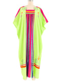 - Lime green striped pink panel cotton caftan dress with ribbon fringe at bust and back, and hand embroidery throughout