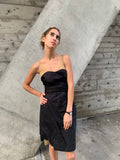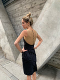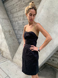 Gorgeous draped embossed satin fabric strapless dress with nude tulle straps, chest and back with black buttons. A dress that evokes old Hollywood glamour. Very good vintage condition.