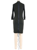 - Army green knit dress with three-quarter-length sleeves and leather lace up detailing down center front and back
