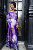 Flowy silk peasant dress with gathered waist, cuffs and elastic neckline that is meant to be worn off the shoulders. Either hand-painted or silk-screened with a loose, abstract floral pattern in blue and pink.