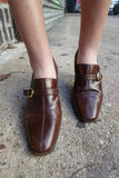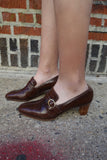 Classic brown heeled loafers with front strap and round buckle. Brand is Evina, made in Italy.