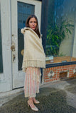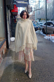 A unique 1970s cream wool cape, with a turtleneck collar and fun fringe. There is a faint stripe in wool and crochet detailing. Tag reads Handwoven in Greece by Panos, 90% wool, 10% cotton.