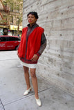 Oversized suede jacket in red and gray with knit edging and top stitching. Tag reads "Norma Canada". Knit part is cotton/rayon/mohair blend.