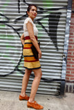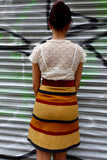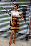 Wonderful pieced striped suede skirt in fall colors (burgundy, tan, navy, mustard).