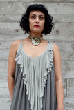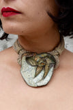 Great example of an 80s artisan jewelry piece. The pendant is made of ceramic and is suspended from different kinds of woven cord. It looks like a flower of some type. The necklace is tied around the model's neck instead of closed with the closure.
