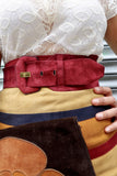 Dark red wide suede belt with a gold metal tab on the buckle.