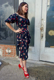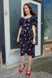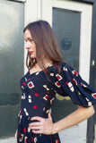 Fun 1980s-does-1940s dress with a geometric red and white print. There are elasticated puff sleeves and flounces on side, the cut is very flattering. Dress is 100% silk. Tag reads Hype New York.