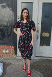 Measurements: 17" across bust, 13" across waist, 44.5" total length. Marked as a size 6, runs a bit smaller. Dress would fit a modern size 2-4.