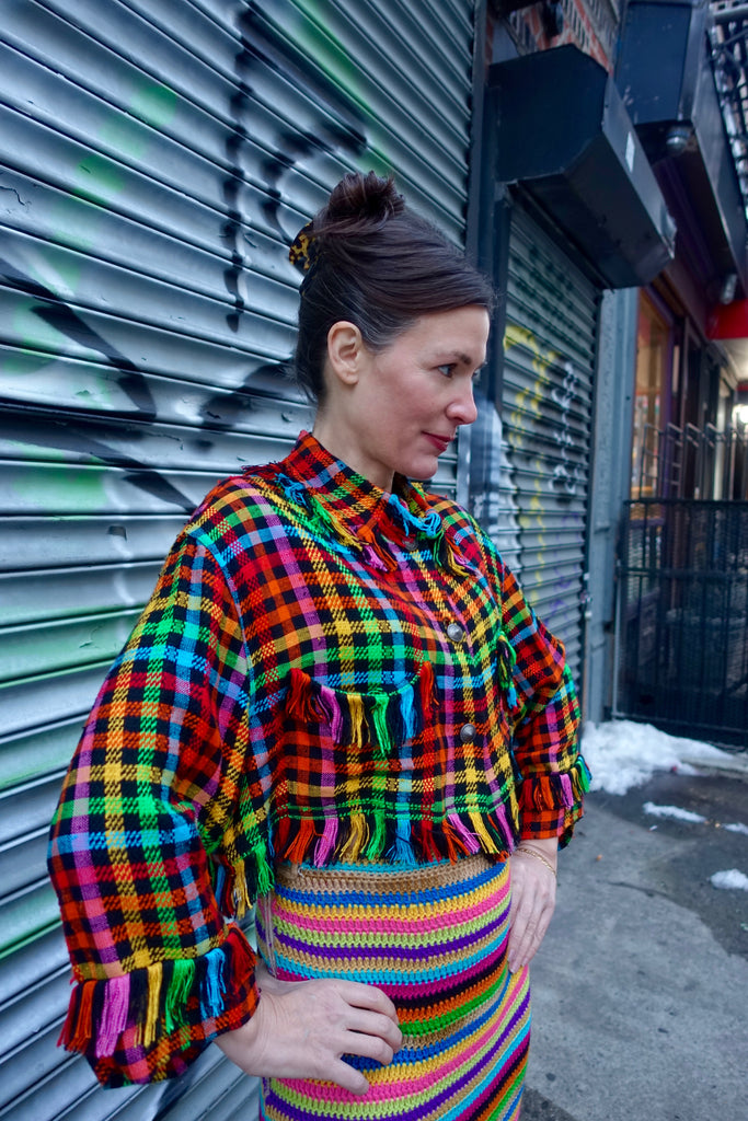 Colorful Ozbek jacket in rainbow houndstooth print, with fringe on collar, pockets and hem. A rare find!